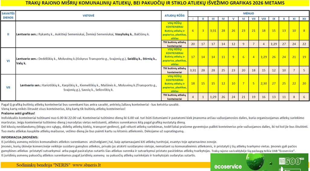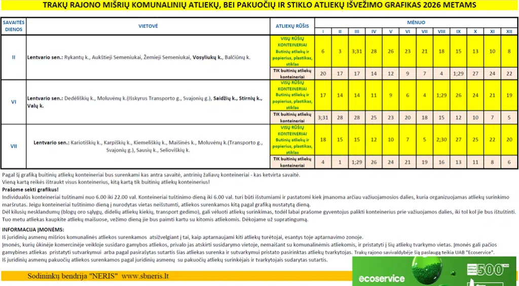 TRAKŲ RAJONO MIŠRIŲ KOMUNALINIŲ ATLIEKŲ, BEI PAKUOČIŲ IR STIKLO ATLIEKŲ IŠVEŽIMO GRAFIKAS 2026 METAMS Leave a Comment / Bendra informacija / By Renaldas Atliekų surinkimo 2026 m. grafikas | Trakų rajono savivaldybė Share