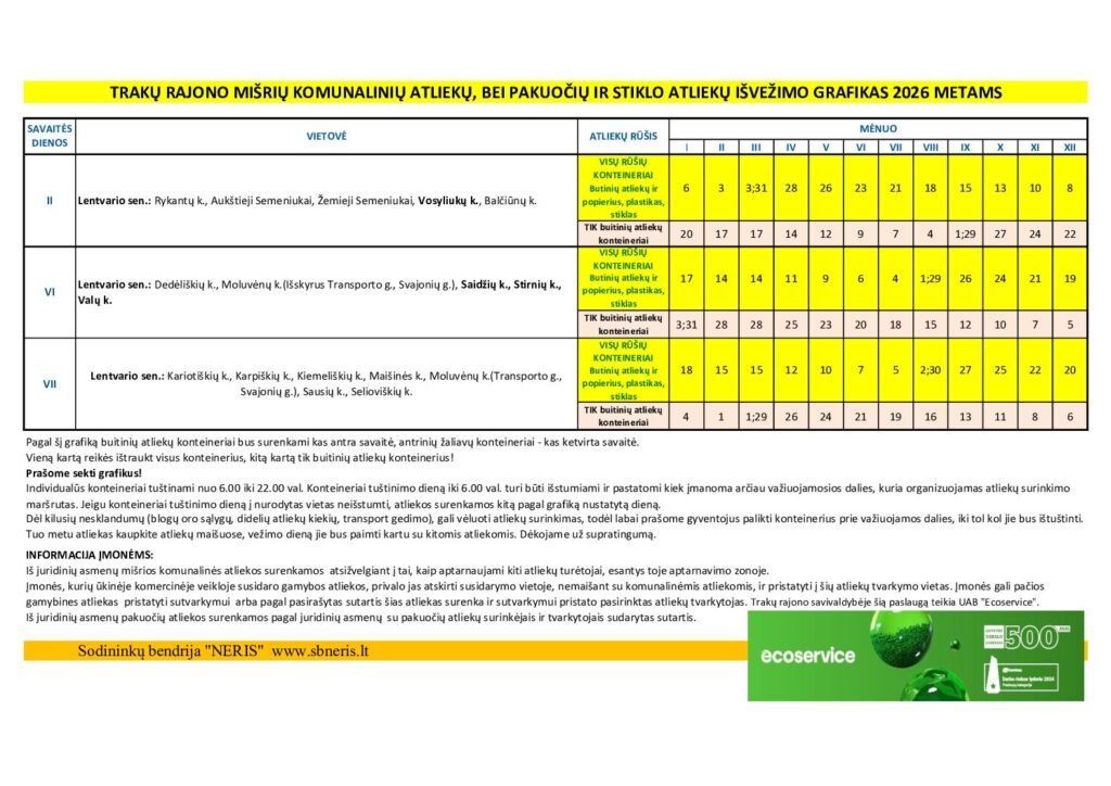 TRAKŲ RAJONO MIŠRIŲ KOMUNALINIŲ ATLIEKŲ, BEI PAKUOČIŲ IR STIKLO ATLIEKŲ IŠVEŽIMO GRAFIKAS 2026 METAMS Post author:Renaldas Post published:2026-01-12 Post category:Bendra informacija Post comments:0 Comments Share You Might Also Like Neries bendrijos teritorijos tvarkymo talka 2016-03-31 TRAKŲ RAJONO MIŠRIŲ KOMUNALINIŲ ATLIEKŲ, BEI PAKUOČIŲ IR STIKLO ATLIEKŲ IŠVEŽIMO GRAFIKAS 2019 METAMS 2019-01-10 ĮVYKO LIETUVOS SODININKŲ DRAUGIJOS, REGIONINIŲ SODININKŲ SUSIVIENIJIMŲ (ASOCIACIJŲ) ATSTOVŲ IR VILNIAUS SUSIVIENIJIMO „SODAI“ NARIŲ KONFERENCIJA 2017-05-31 Parašykite komentarą Atšaukti atsakymąYou must be logged in to post a comment.
